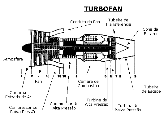 Se no caso dos turbopropulsores e turborreactores apenas existe um escoamento, nos turbofan existe ainda o escoamento secundário que se processa através da conduta da fan. As secções colocadas ao longo do escoamento primário identificam-se por um digito ou dois, sendo que o primeiro (quando existem dois) se inicia sempre por um algarismo diferente de 1. As secções atravessadas pelo escoamento secundário são constituídas por dois algarismos, sendo que o primeiro é sempre o algarismo 1.